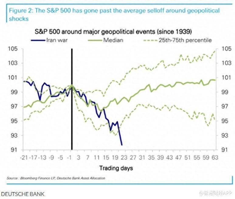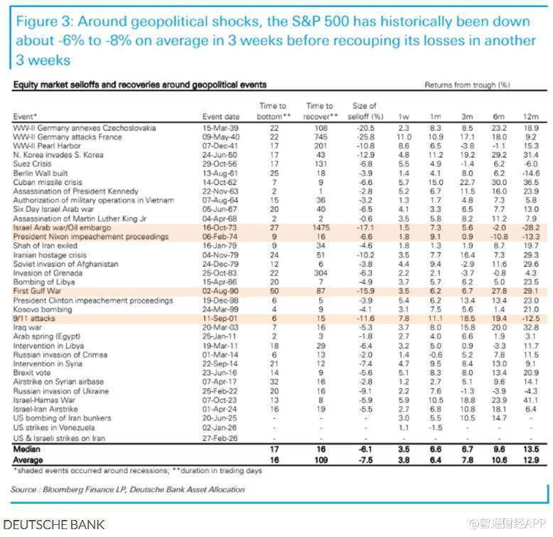 这一判断主要基于历史经验。德意志银行策略团队的统计显示,在过去的地缘政治冲击中,标普500指数平均需要约16个交易日触底,随后在约109天内完成修复。不过,该均值受到1973年阿拉伯石油禁运后的极端情况影响较大,当时标普500指数花了超过五年半才完全收复失地。