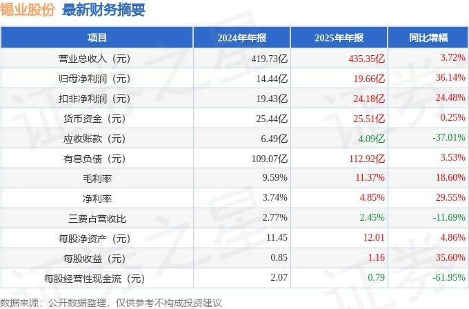 据证券之星公开数据整理,近期锡业股份(000960)发布2025年年报。截至本报告期末,公司营业总收入435.35亿元,同比上升3.72%,归母净利润19.66亿元,同比上升36.14%。按单季度数据看,第四季度营业总收入91.18亿元,同比下降28.54%,第四季度归母净利润2.21亿元,同比上升37.32%。本报告期锡业股份盈利能力上升,毛利率同比增幅18.6%,净利率同比增幅29.55%。