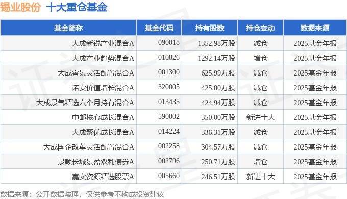持有锡业股份最多的基金为大成新锐产业混合A,目前规模为42.5亿元,最新净值9.131(3月30日),较上一交易日上涨0.46%,近一年上涨64.21%。该基金现任基金经理为韩创。