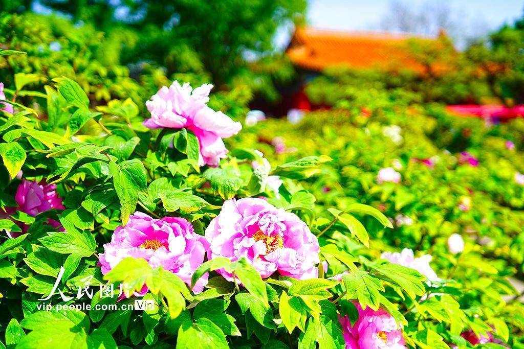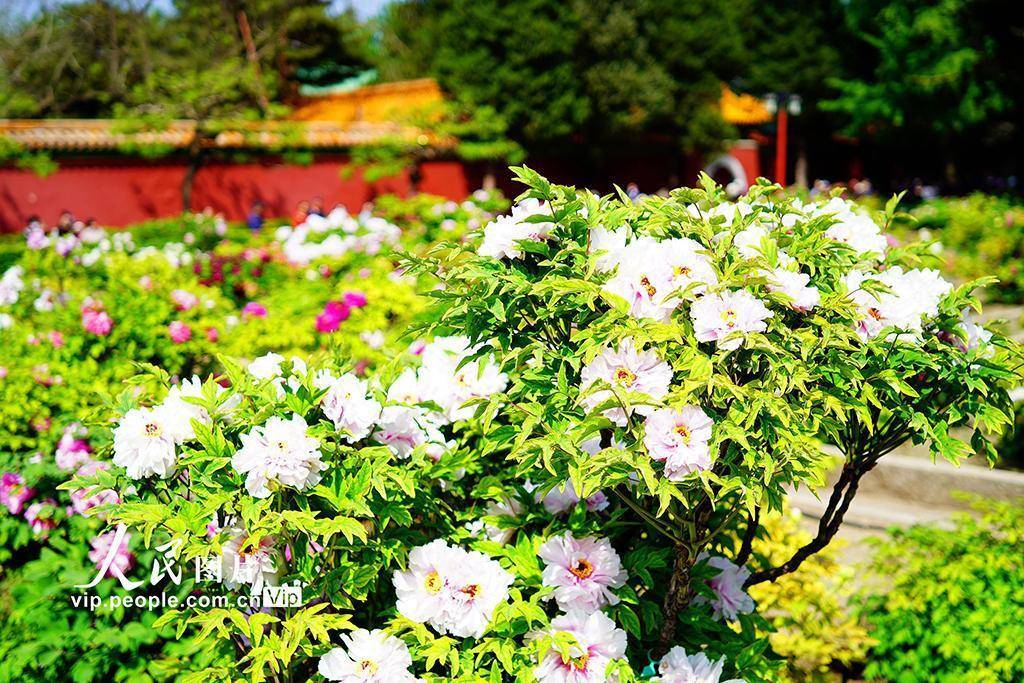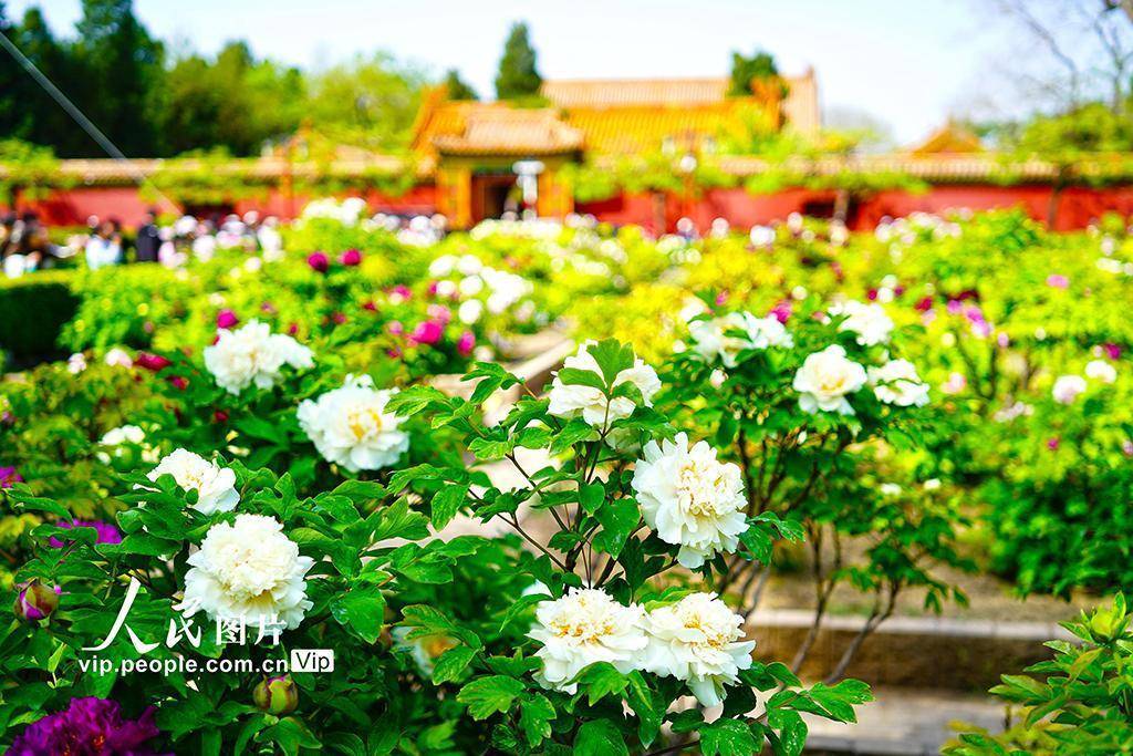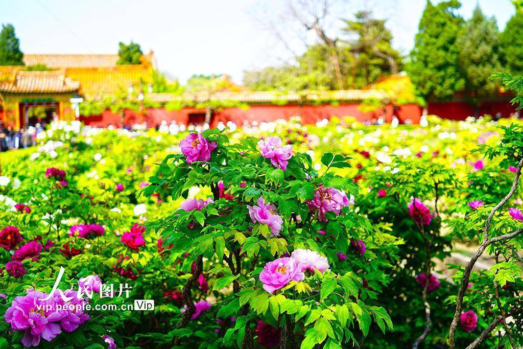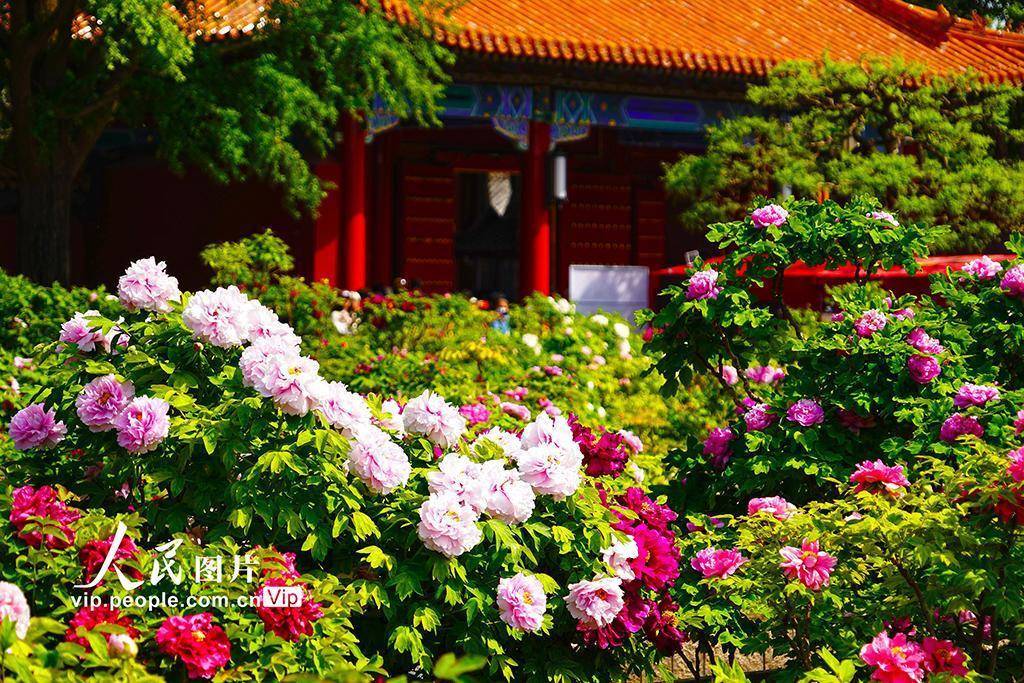 2026年4月21日,北京景山公园牡丹大面积盛开,迎来最佳观赏期。在牡丹映衬下,红墙黄瓦更显韵味,一步一景,如诗如画。宋家儒摄(人民图片网)